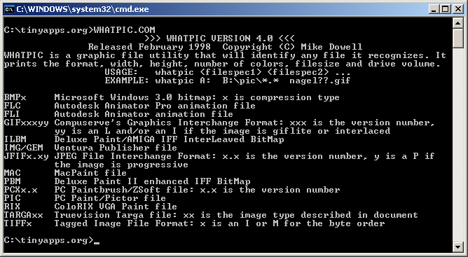 🌱 WHATPIC 4.0 [18k] + Command line utility that returns the format, width, height, number of colors, filesize and drive volume of graphic files. 📺