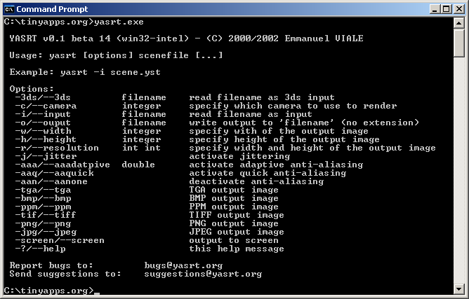 🌱 YASRT v0.1 beta 12 [890k] + Yet Another Simple RayTracer. Generates realistic pictures from text descriptions. Binaries available for a massive range of OSes, from AIX and BeOS to Win32 and Sony PSP. 📺