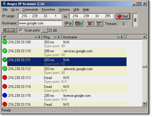 🌱 Angry IP Scanner 2.21 [109k] {S}+ Pings a range of IP addresses and optionally resolves hostnames, scans ports, returns NetBIOS info (computer name, workgroup name, currently logged in user and MAC address), and saves results to CSV, TXT, HTML, XML or IP-Port list files. (While settings can be saved to the registry, this is not the default behavior.) 📺
