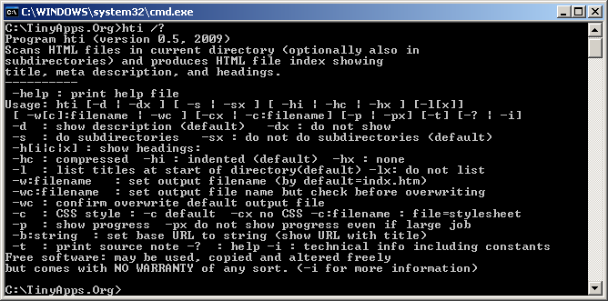 🌱 HTI (Hyper-Text Index) 0.5 [16k] {S}+ Generates an index page of HTML files. Includes titles, meta descriptions, and H1 - H6 headings. ANSI C source code available on request, on a "don't laugh" basis. 📺