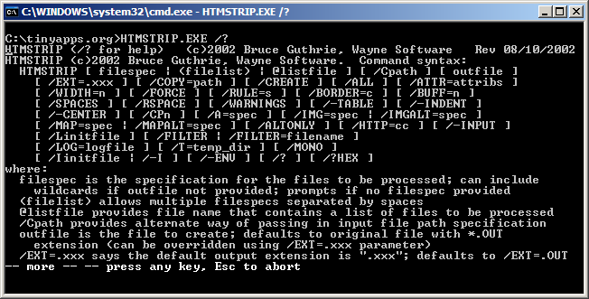🌱 HTMStrip 0208 [125k] + "Processes and removes embedded HTML commands from Web pages downloaded from the Web. Reflows paragraphs, processes tables, etc as straight ASCII text. Can function on individually-saved pages or else process your entire disk cache. Ideal tool for resending via e-mail or dozens of different uses. Awarded a 'Best' rating by 'PC Computing' in their July 1996 issue." 📺 💾