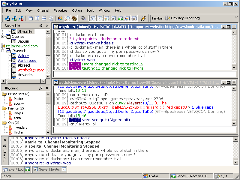 HydraIRC [740k] {S}+ Open source IRC client with support for: DCC chat and file transfers, connecting to multiple servers, dockable floating tabbed windows, channel monitoring, message logs, event viewer, reg-exp highlighting, and much more. 📺