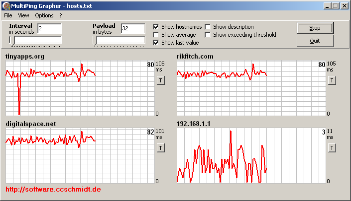 MultiPing Grapher 1.4.1 [284k] + Graph up to 10 different ICMP results. Adjust ping interval and packet size. Includes logging and average calculation. 📺