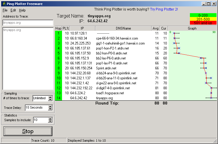 PingPlotter 1.10 [424k] Graphical network troubleshooting and diagnostic tool. Shareware version also available (feature comparison). 📺 💾