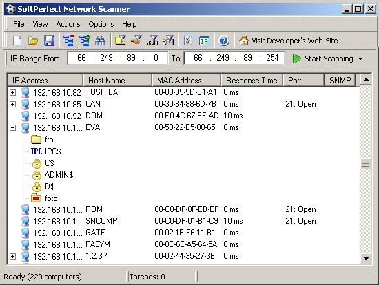 SoftPerfect Network Scanner 3.3 [619k] + IP, NetBIOS, and SNMP scanner with a slew of features: fast multithreaded scanning; computer pinging; hidden shared resource detection; scanning for listening TCP ports; mount and explore found resources; resolve host names; autodetect local and external IP range; support for remote shutdown and Wake-On-LAN (WoL). 📺