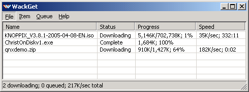 WackGet 1.2.2 [127k] {S}+ Download a list of files in the order you specify. Options include: logging, setting number of concurrent downloads, importing from clipboard, and more. Source code 📺 💾 🌎