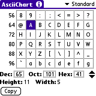 AsciiChart 2.0.4 [17k] ASCII chart which displays decimal, octal and hexadecimal values for characters as well as their height and width. 📺