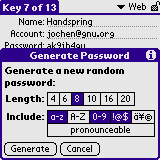 Keyring for Palm OS [72k] {S} Securely store secret information on your PalmOS handheld. Triple-DES encryption, random password generator, export to MemoPad, and support for a number of languages. 📺