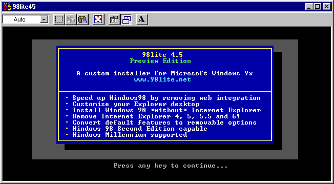 98lite Preview 4.5 [318k] Remove web integration and many other resource-hogging "features" from Windows 98/Me. 📺