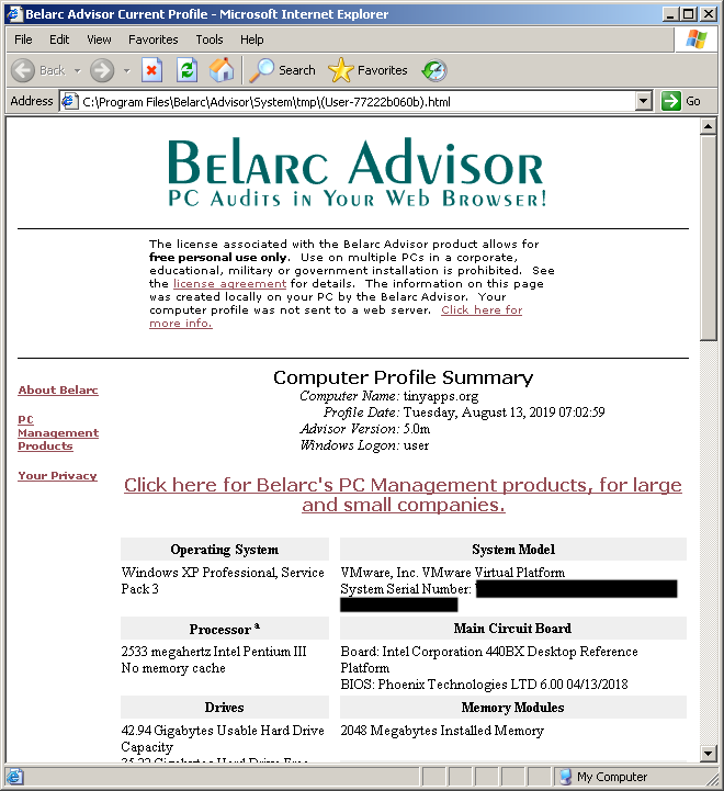 Belarc Advisor 5.0m [589k] "Generates an HTML profile of everything installed on your computer, from your main circuit board to software. Version, manufacturer, and serial numbers are listed, as well as statistics such as available memory slots and hard drive space." Free for personal use. 📺