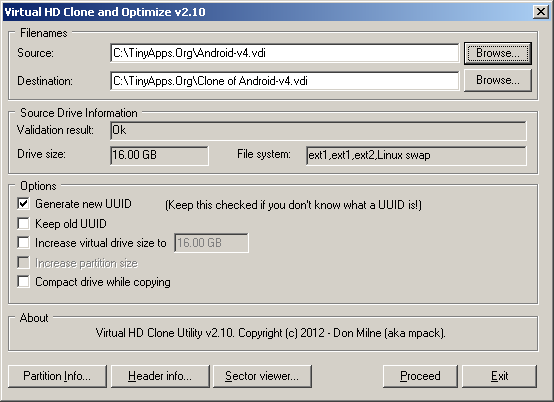 🌱 CloneVDI 2.10 [118k] {S}+ Converts Microsoft VHD, VMWare VMDK, Parallels HDD, raw disk/partition images, and physical drives to VirtualBox VDI; clones VDI files (independent of and significantly faster than VBoxManage.exe) with a number of options (compact image, change UUID, increase virtual disk and/ partition size, merge snapshots); and more, including extensive documentation. 📺