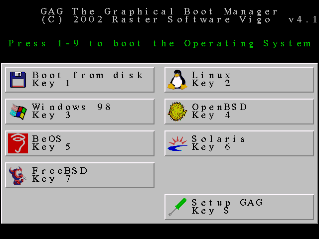 🌱 GAG 4.10 [1392k] {S}+ Full-featured graphical boot manager with support for up to 9 different operating systems. 📺