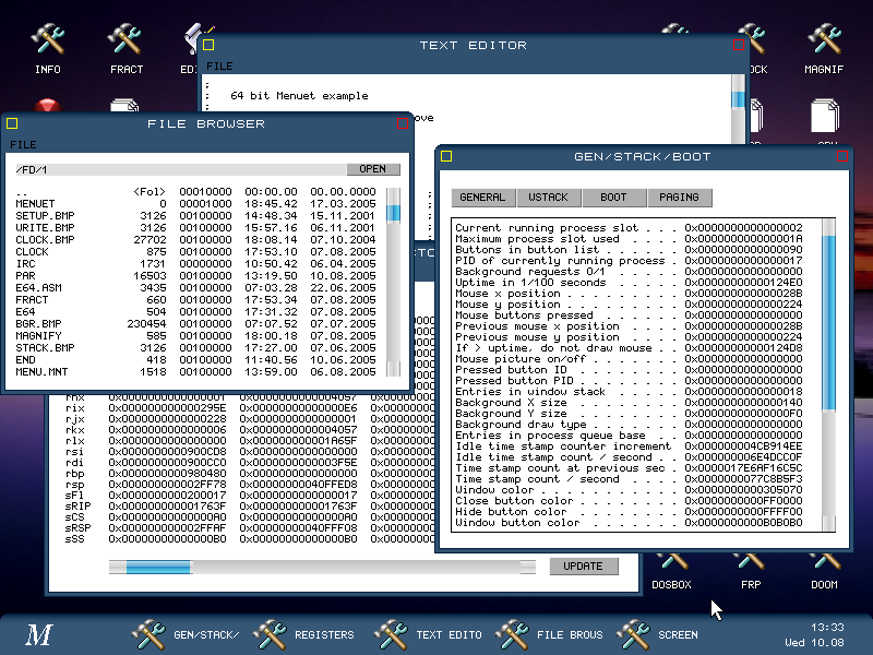 🌱 MENUET OS [1420k] {S}+ "An OS written fully in 32 bit assembly. It's a Real-Time, graphical OS for 32 bit asm programming, and it fits on a single floppy." 📺