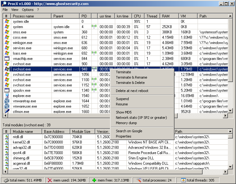 Process Explorer 8.20 [230k] + Process viewer/killer. Displays process icon, command-line, full image path, memory statistics, user account, security attributes, DLLs. Also includes search function. 📺