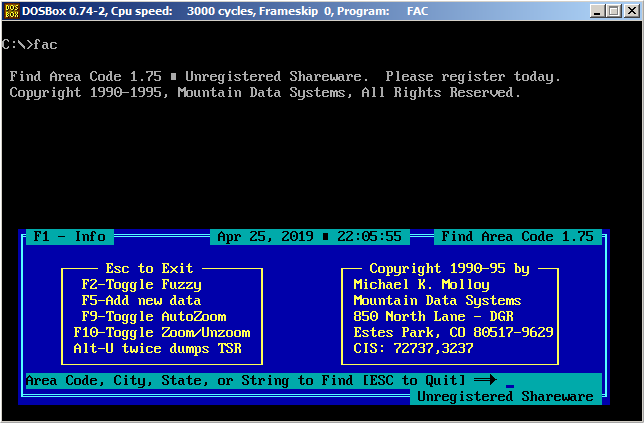 🌱 FAC 1.75 [92k] + DOS TSR-capable, simple PIM with freeform/fuzzy search. Includes an (old but updatable) area code database. Was shareware, now donationware. 📺 💾