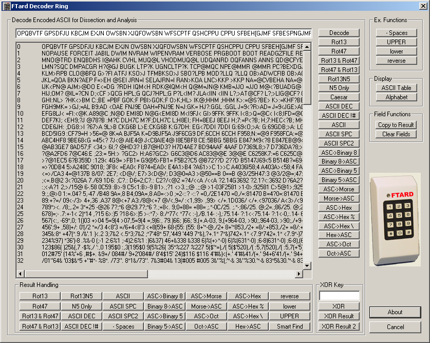 🌱 FTard Decoder Ring 2.0.1.5 [154k] + Decode rotated ASCII for analysis. Supports ROTX, ROT13, ROT47, XOR, Caesar, Binary, Hex, Octal, Morse, more. 📺 💾