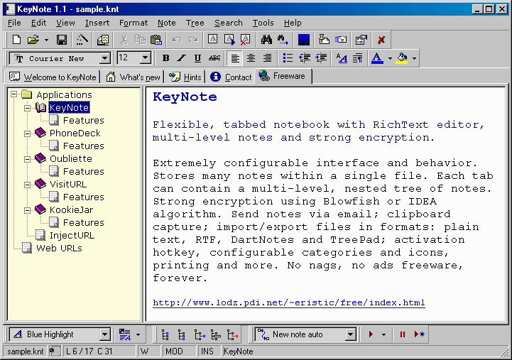 KeyNote 0.999 [703k] {S}+ Treepad-like app with RichText support, encryption (Blowfish or IDEA), import/export TXT, RTF, HJT (Treepad), n_text (DartNotes), HTML (import only), and much more. 📺